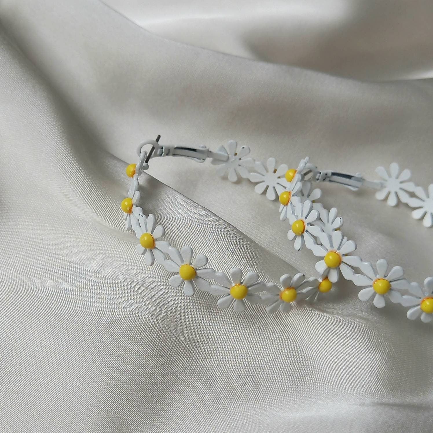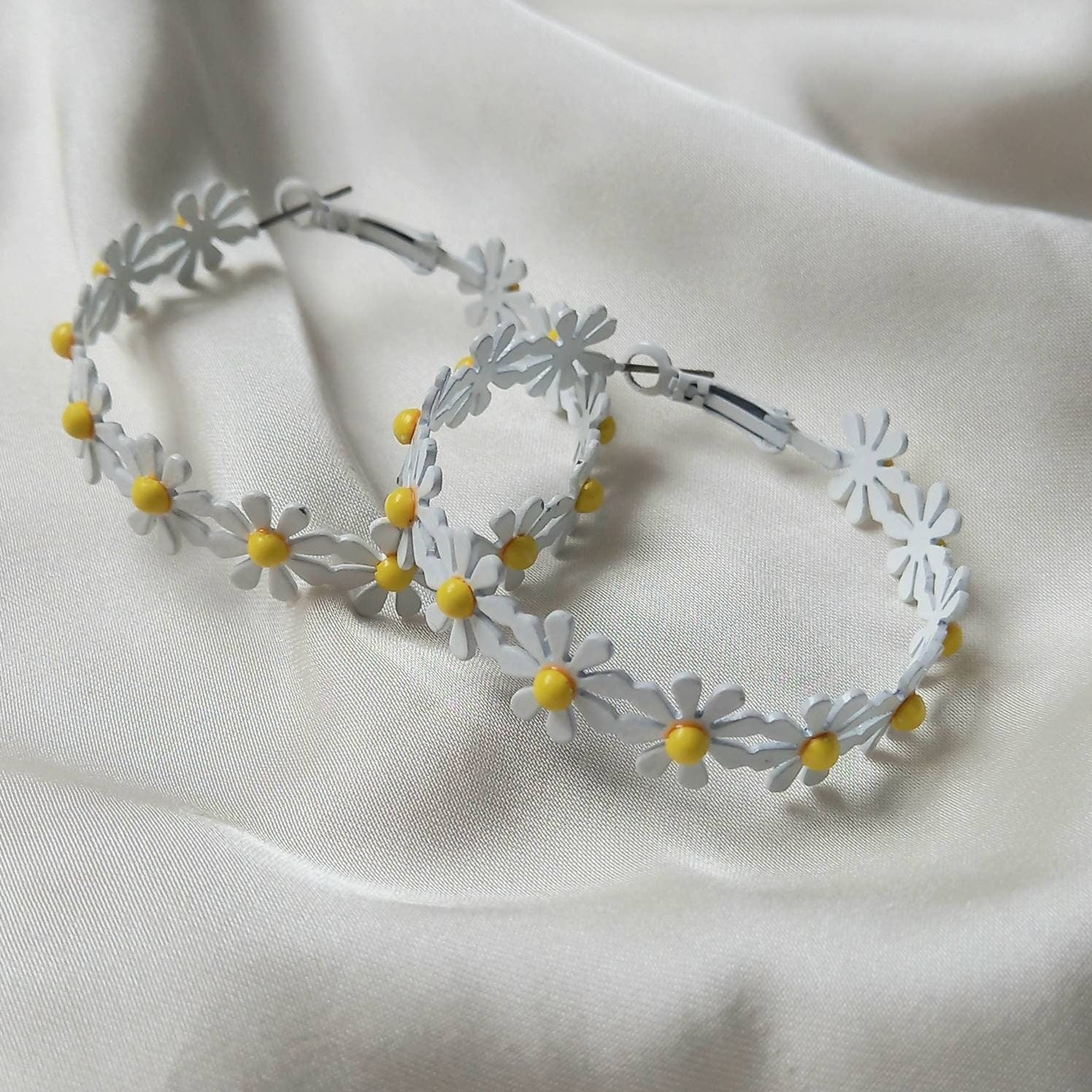 Don't miss out on these beautiful daisy hoop earrings. They work with a large variety of looks and add a bit of sparkle to your outfit.