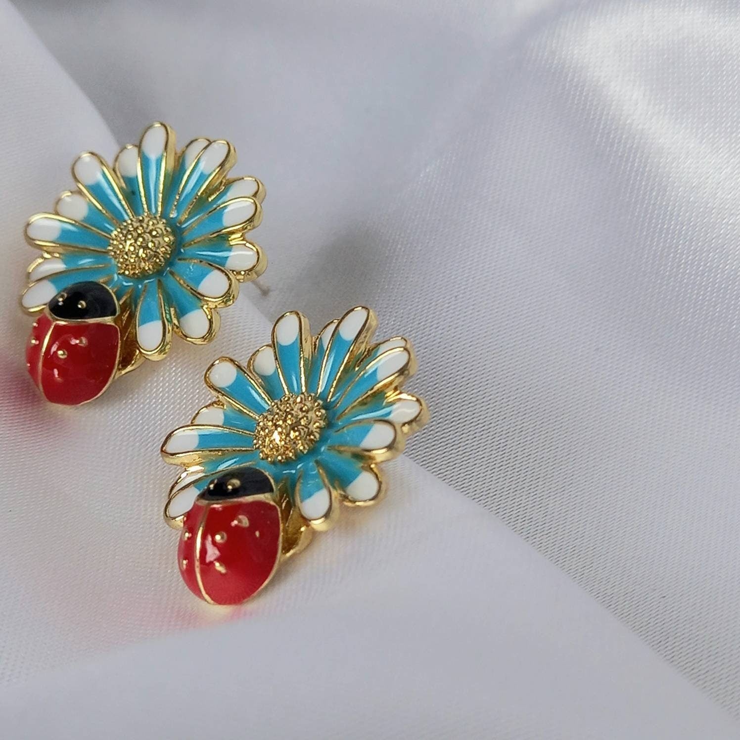 Don't miss out on these beautiful blue flower and ladybug stud earrings. They work with a large variety of looks and add a bit of sparkle to your outfit.