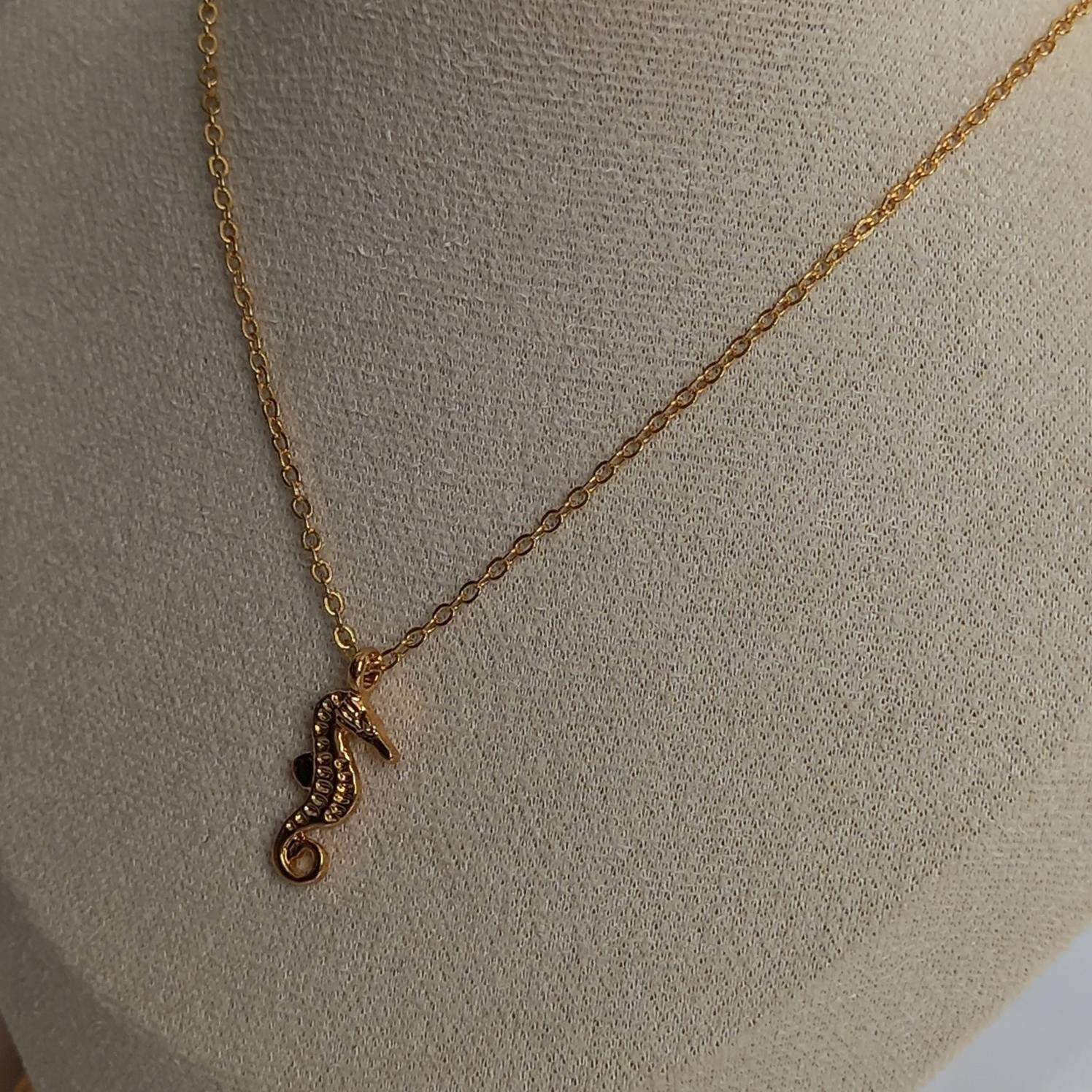 Don't miss out on this beautiful gold plated seahorse charm necklace! It works with a large variety of looks and add a bit of sparkle to your outfit.
