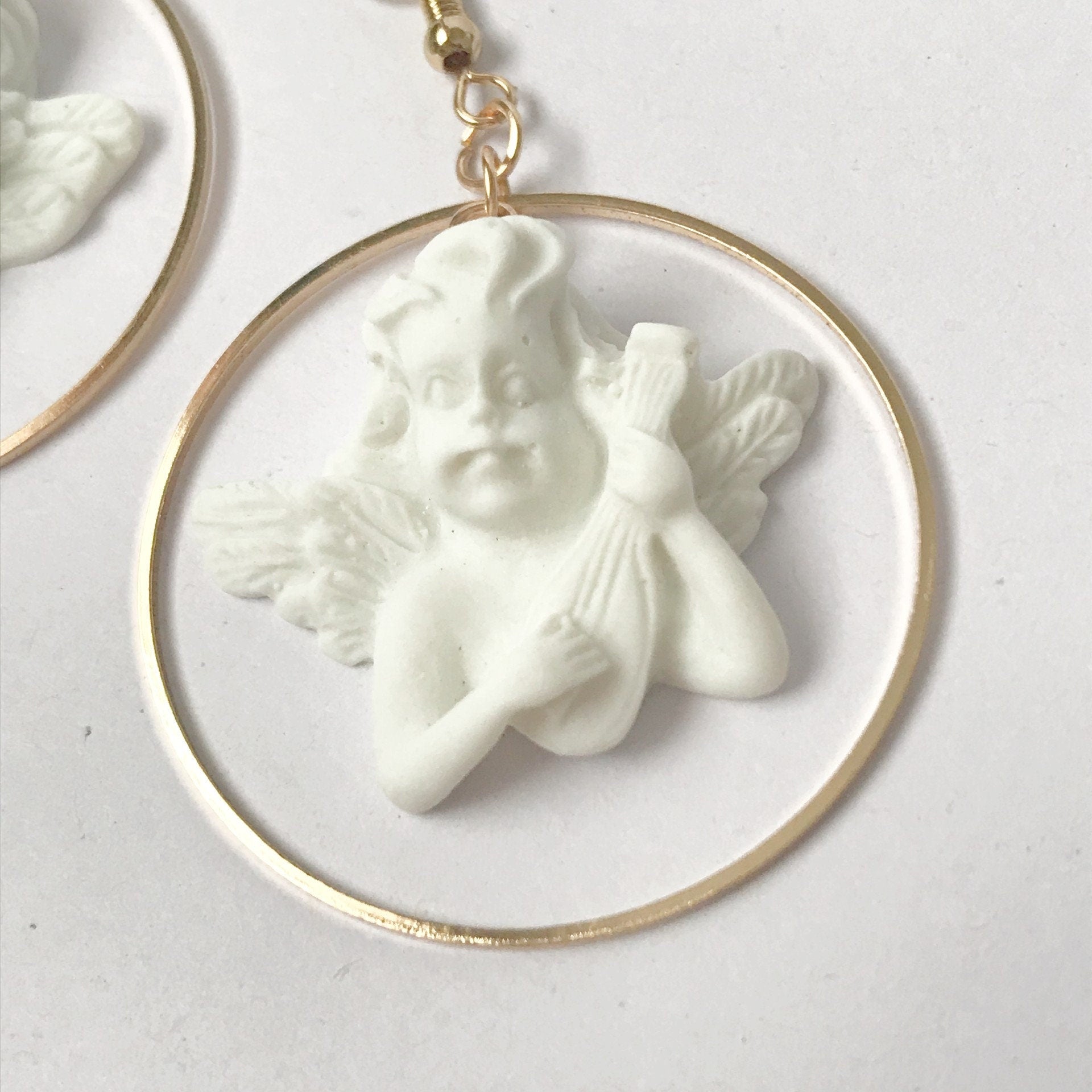 Gold & White Cherub Hoop Earrings - Lightweight Hoop Earrings, Cherub Earrings, Love Earrings, Cute Earrings, Gold Earrings, Gold Jewellery