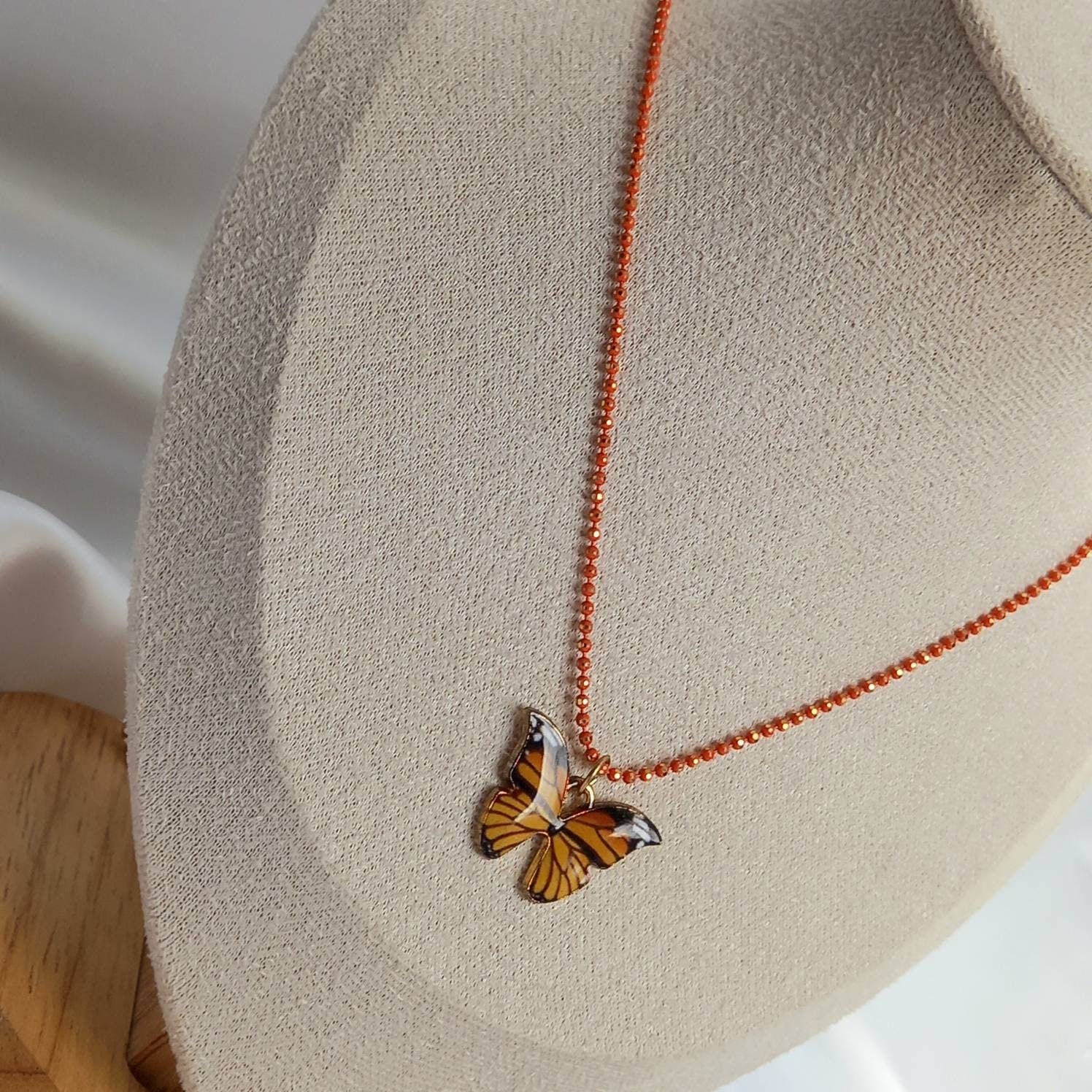 Don't miss out on this beautiful orange butterfly charm necklace. It works with a large variety of looks and add a bit of sparkle to your outfit.