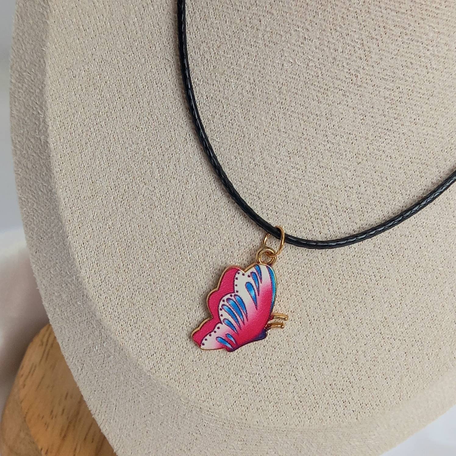 Pink Butterfly Charm Necklace - Pink Butterfly Necklaces,Pink Butterfly Jewellery,Butterflies,Black Necklaces In The UK,Jewellery In The UK