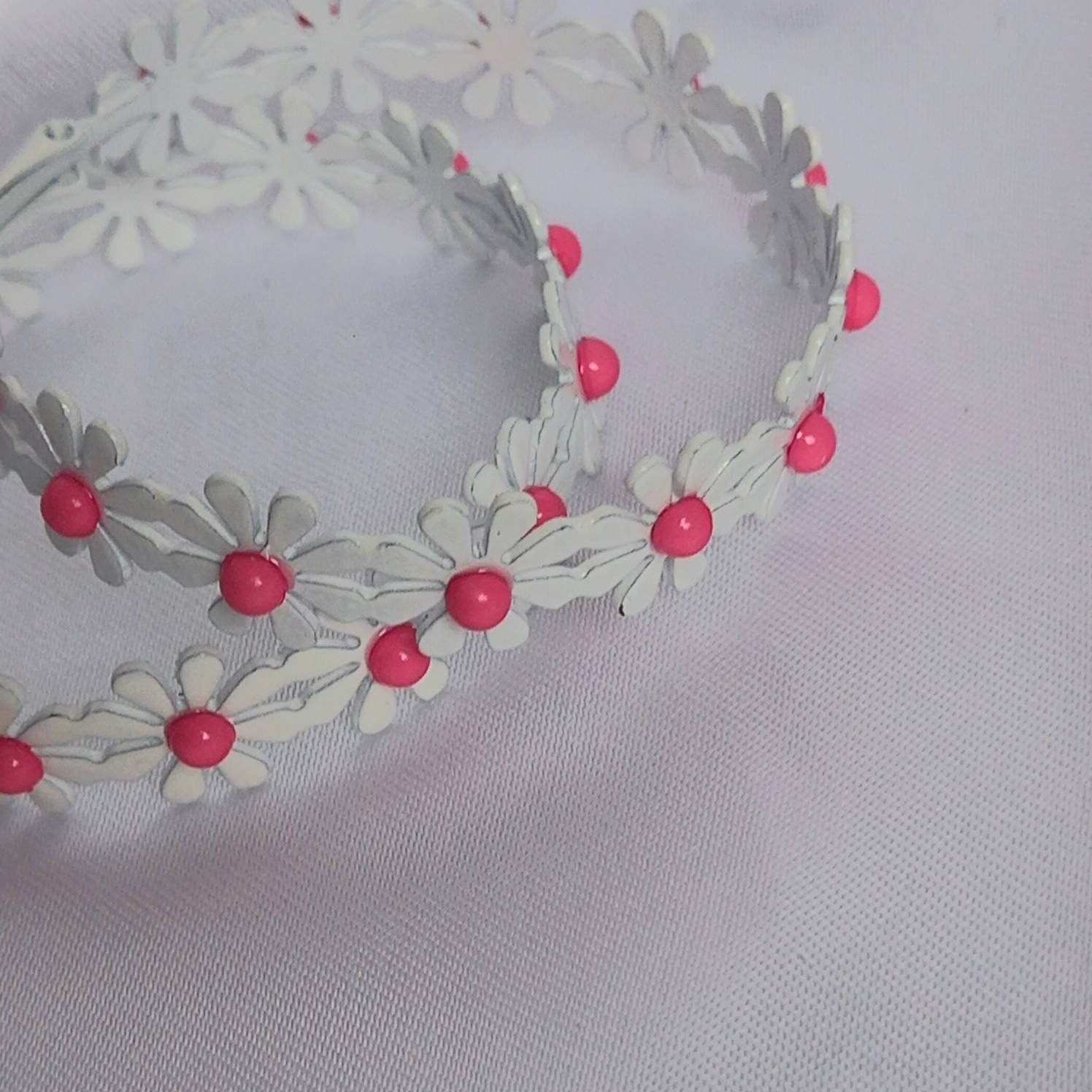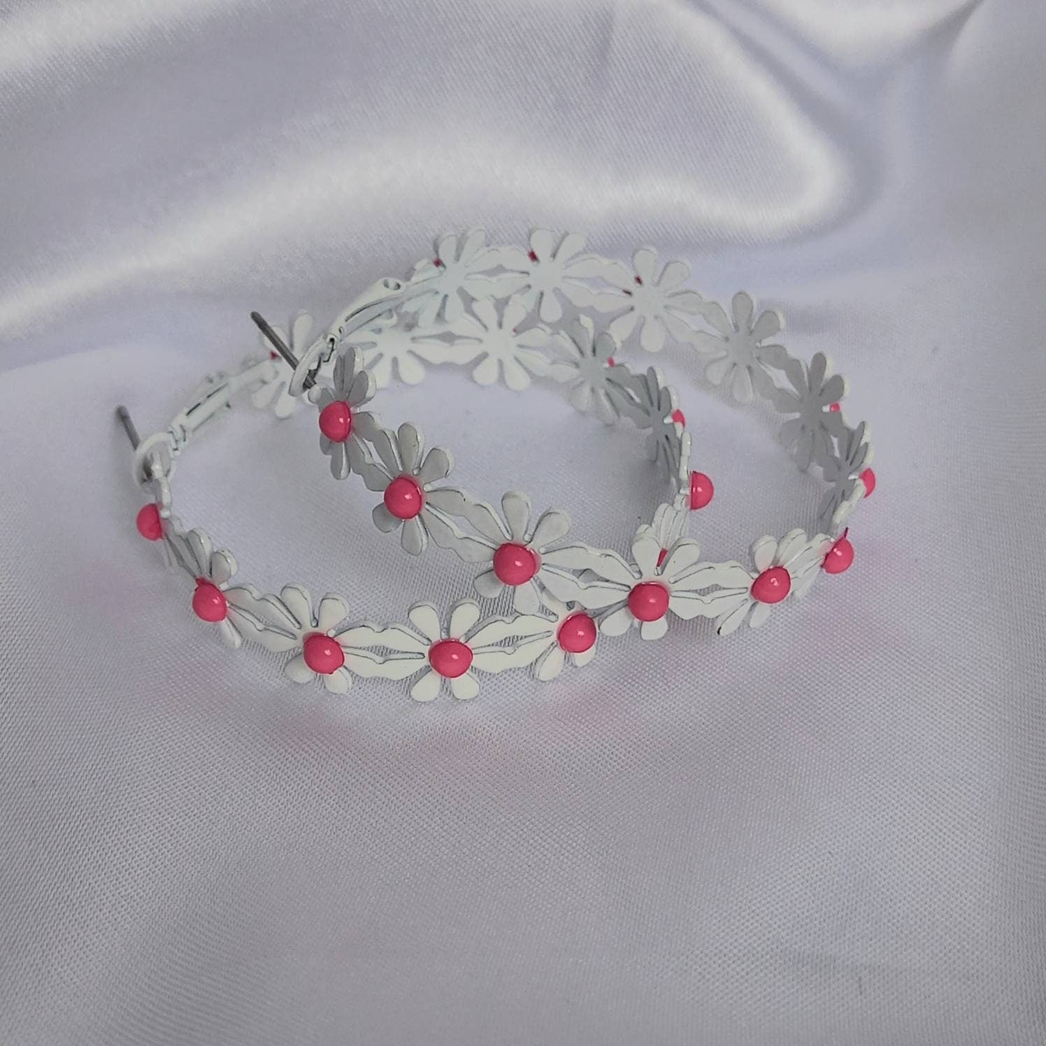 Don't miss out on these beautiful pink daisy hoop earrings. They work with a large variety of looks and add a bit of sparkle to your outfit.