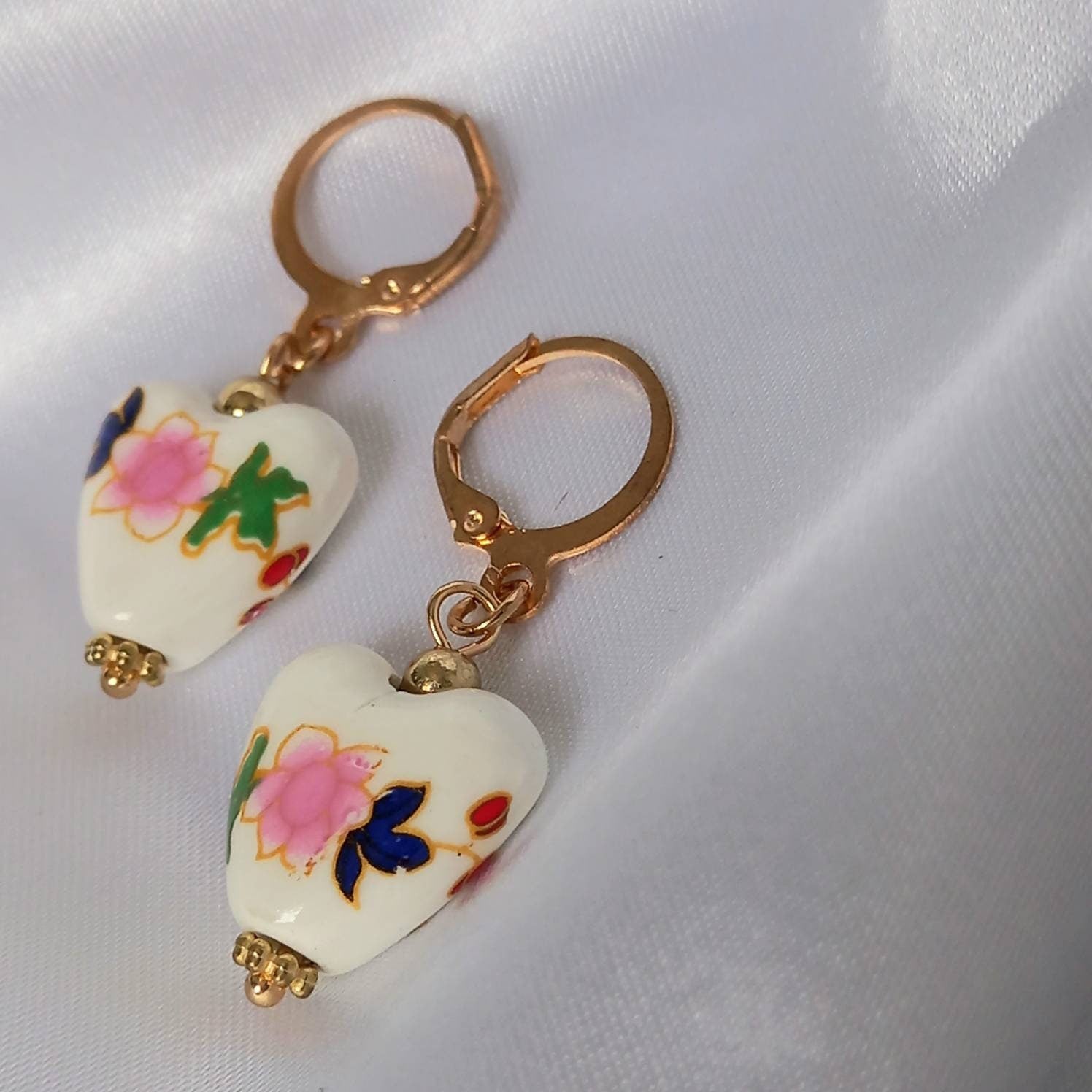 Don't miss out on these beautiful gold & floral heart bead drop earrings. They work with a large variety of looks and add a bit of sparkle to your outfit.