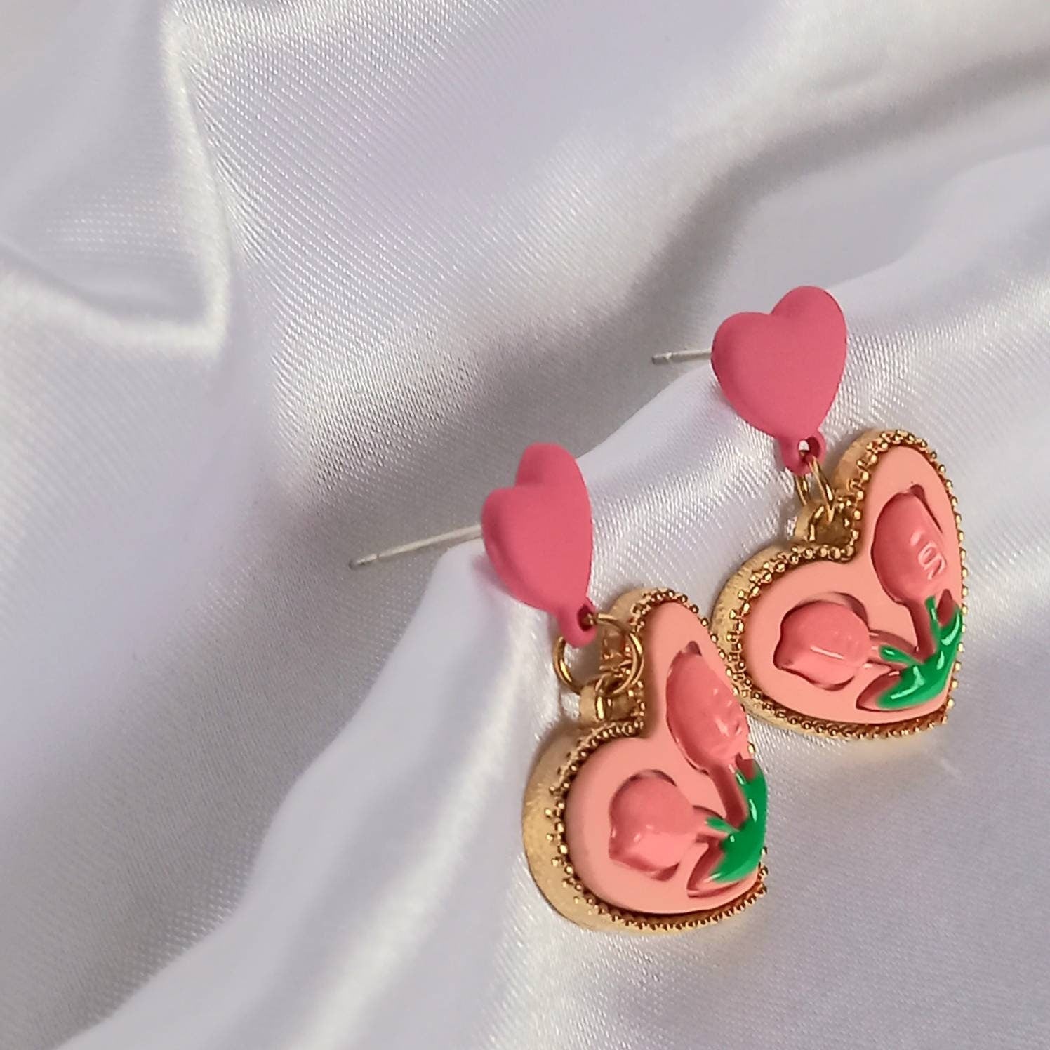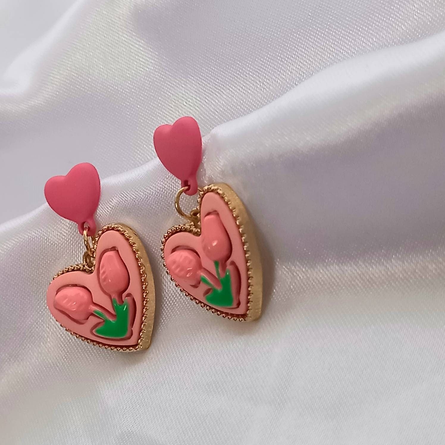 Pink Retro Heart Drop Earrings - Pink Earrings,Flower Earrings,Flower Jewellery,Pink Jewellery,Heart Earrings,Heart Jewellery,Tulip Earrings