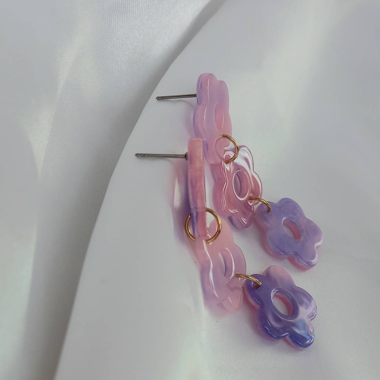 Purple Flower Drop Earrings-Purple Flower Earrings In The UK,Purple Flower Jewlellery In The UK,Retro Earrings,70's Earrings,Purple Earrings