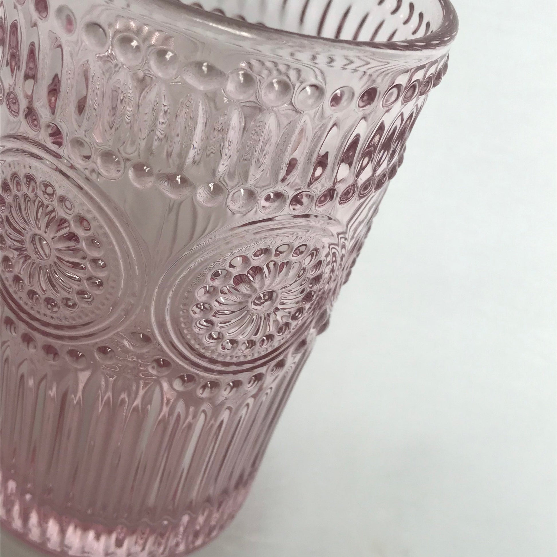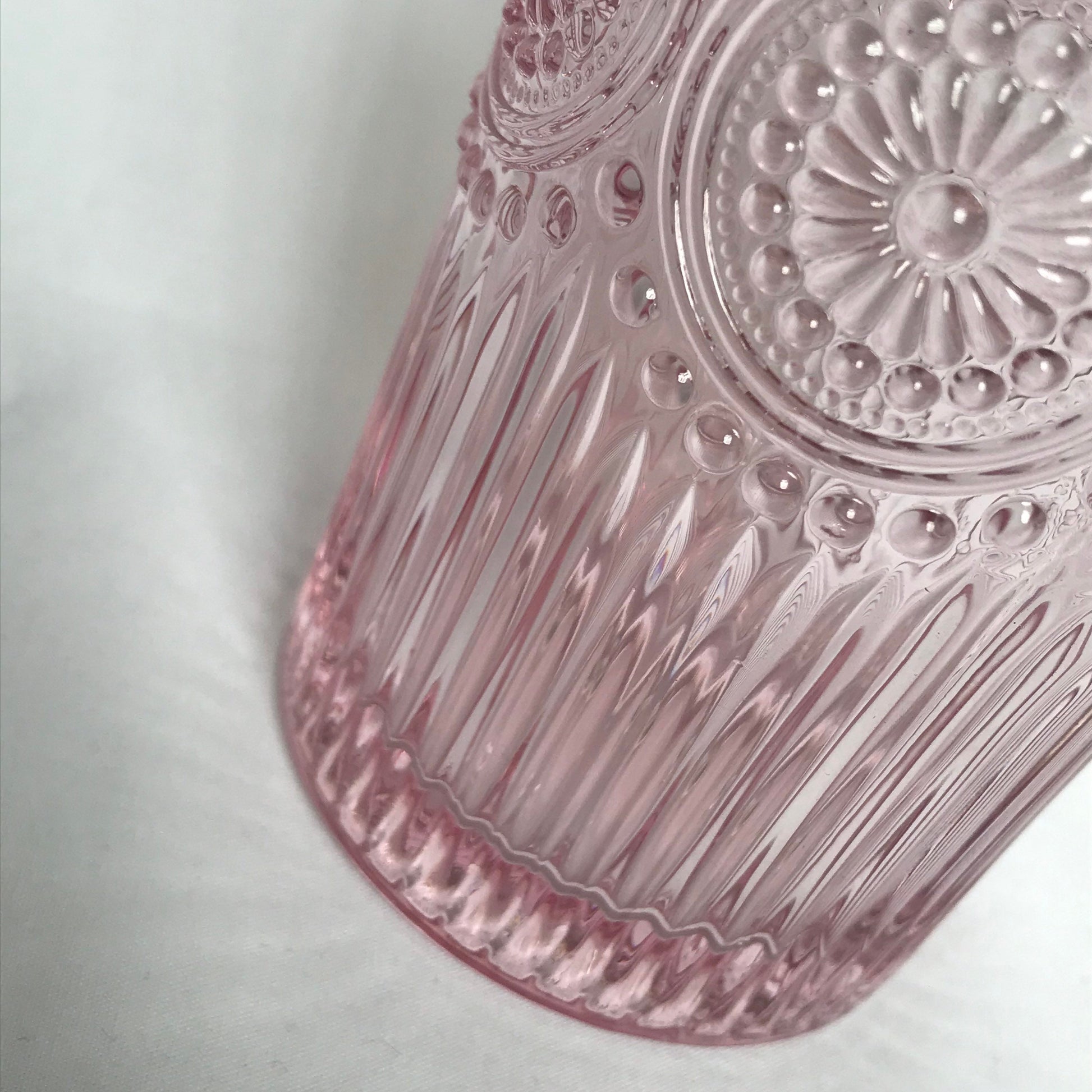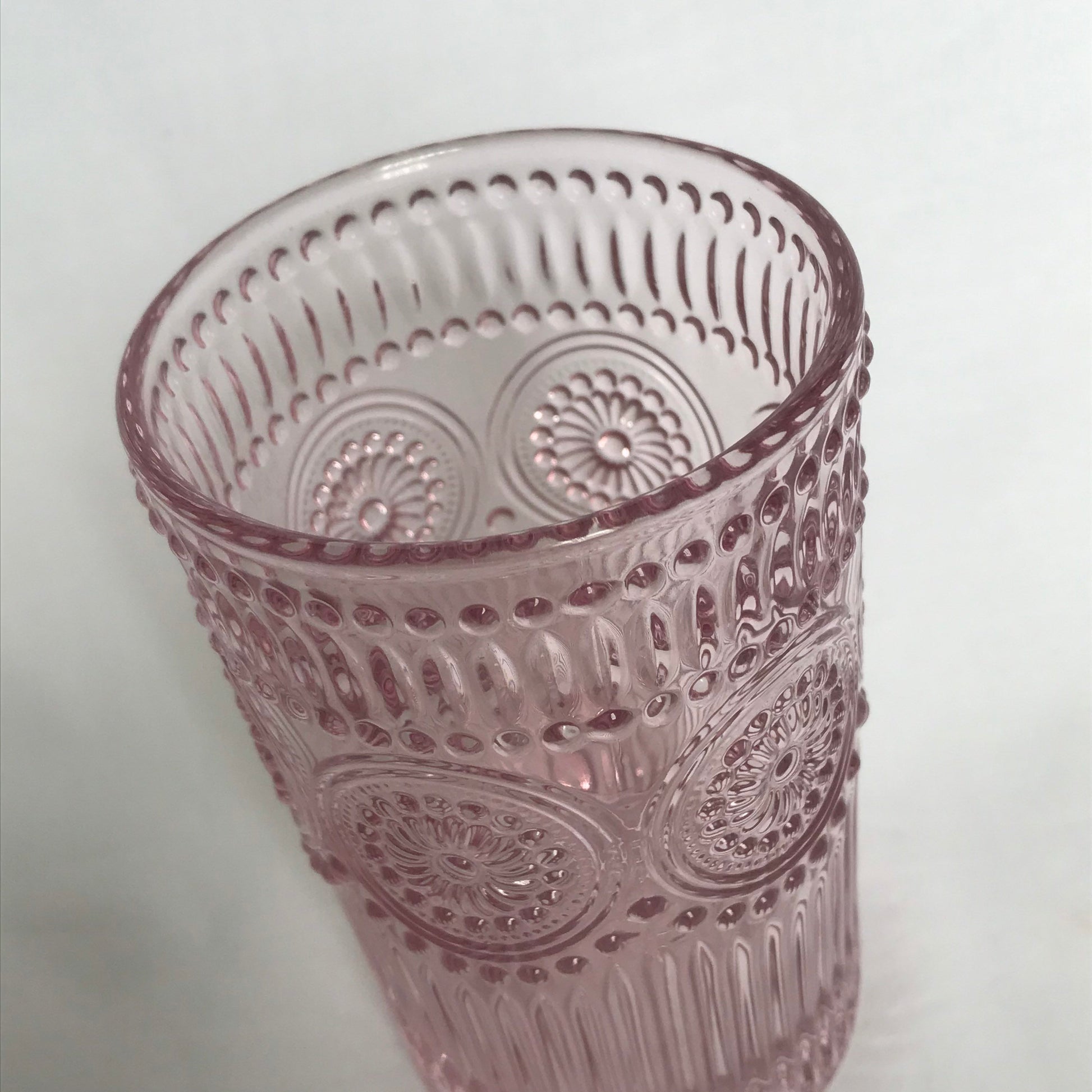 Treat yourself or someone you love to the beautiful tall pink patterned glass tumbler.
